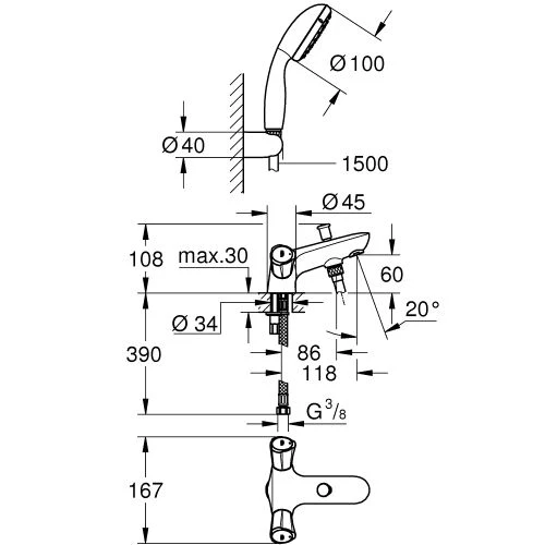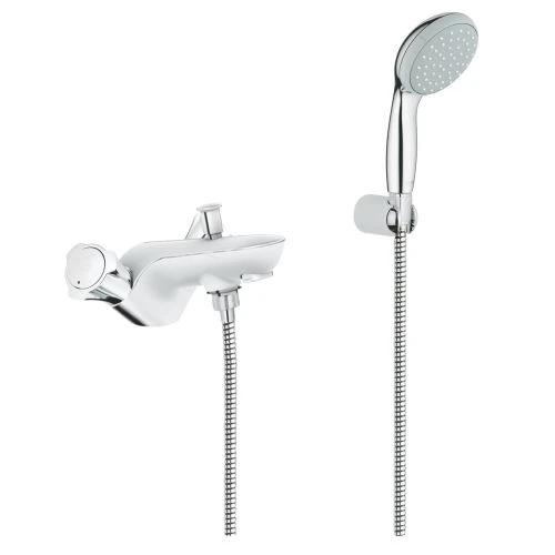 Ce mélangeur bain douche monotrou COSTA L de la marque Grohe est accompagné par un douchette à main Tempesta 100 monojet, un support mural pour douchette et un flexible de raccordement souple avec set de douche. En plus, il possède une poignée métallique vissée avec isolation thermique, un inverseur automatique bain/douche et un mousseur.